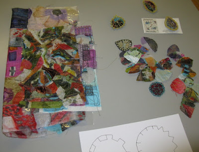 Ann showed us how to make a background material on ordinary plastic and then cut out small interesting shapes from this material to use as a basis for our brooch. To help with timing Ann had already cut out a few for us to use and members rummaged through looking for their favourite colours!